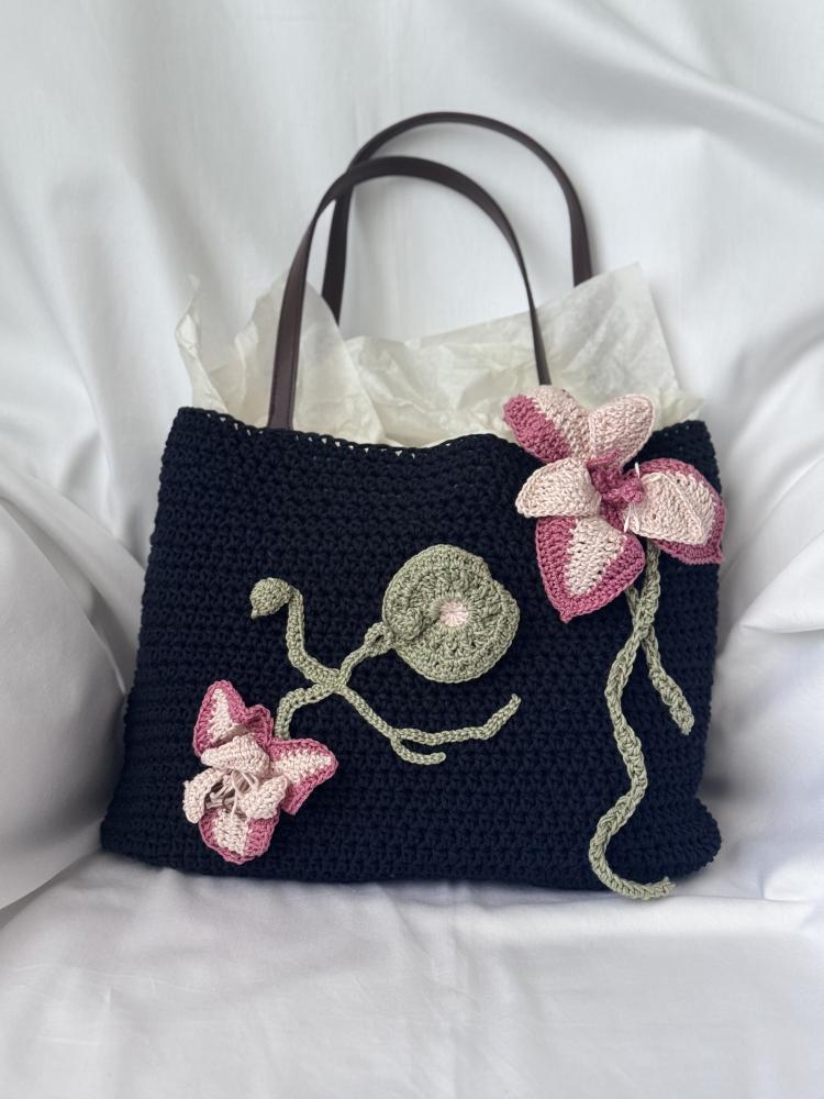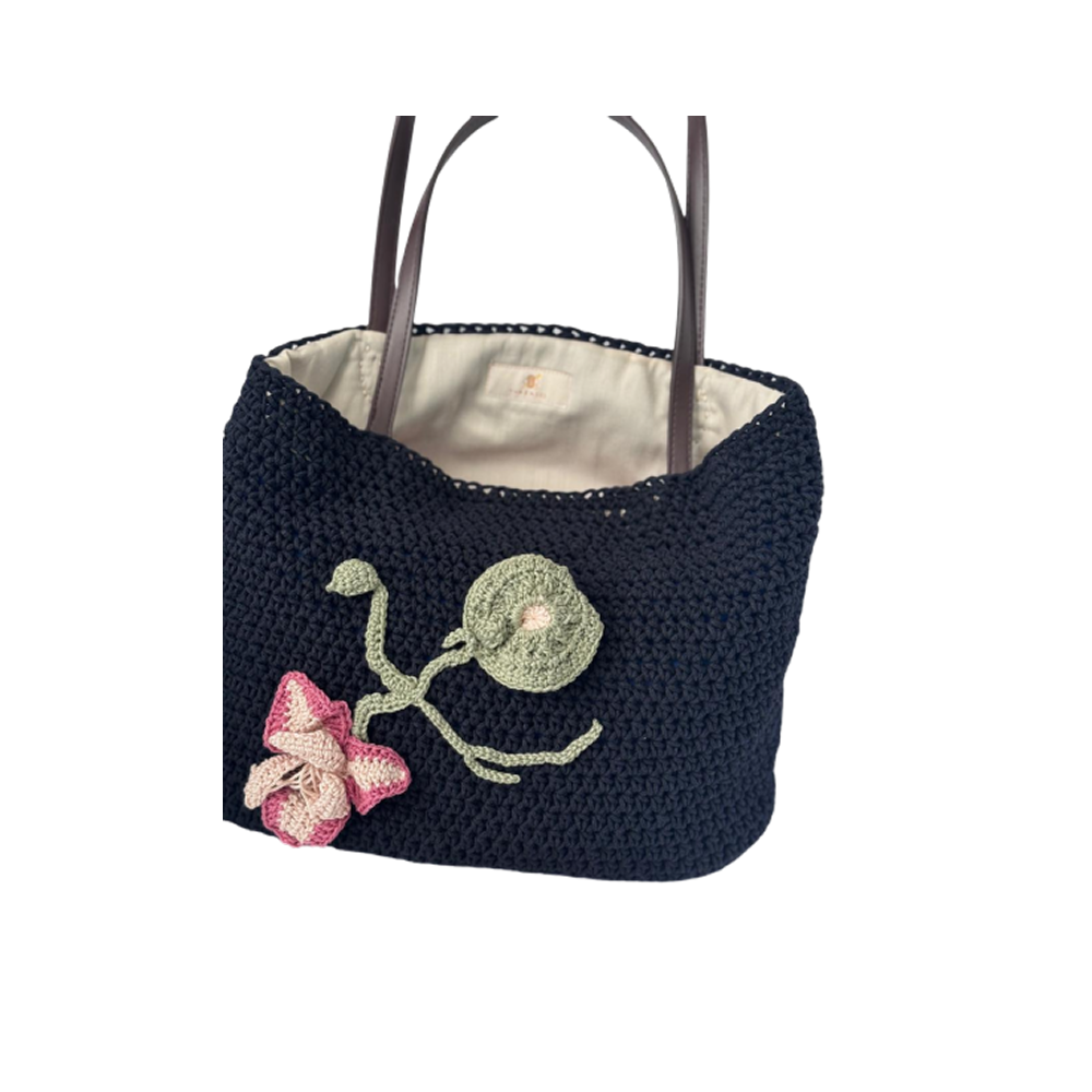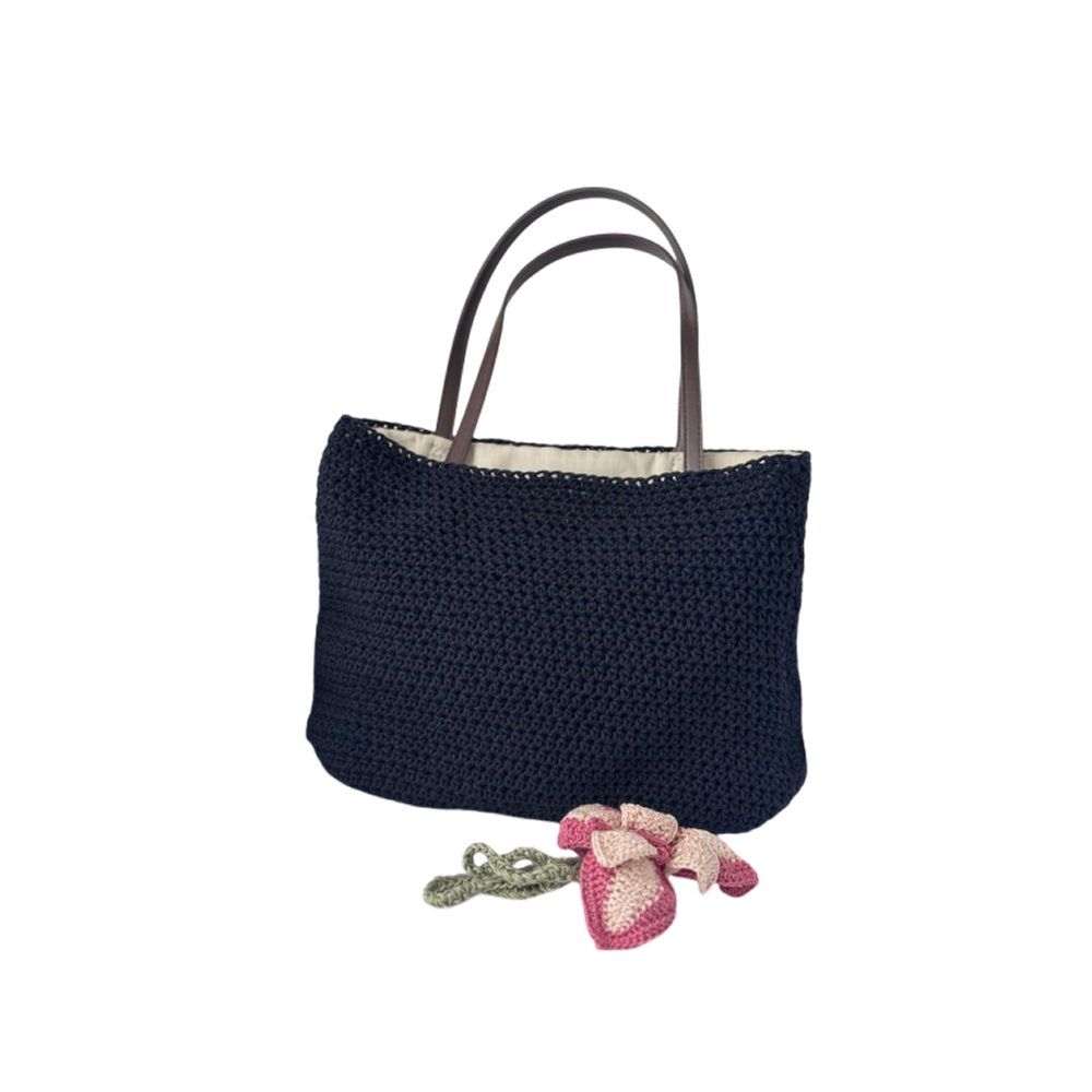 Handmade navy crochet tote bag with a satin interior, dark brown leather handles, pink crochet rose detailing on the bag, and a detachable pink crochet charm. Measures 28 cm in height and 38 cm in length with the depth of 14 cm.