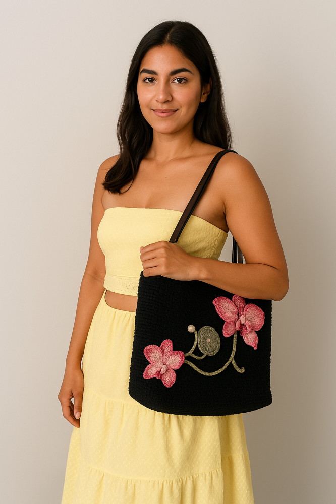 - المواد: كروشيه يدوي، بطانة ساتان، مقابض جلد