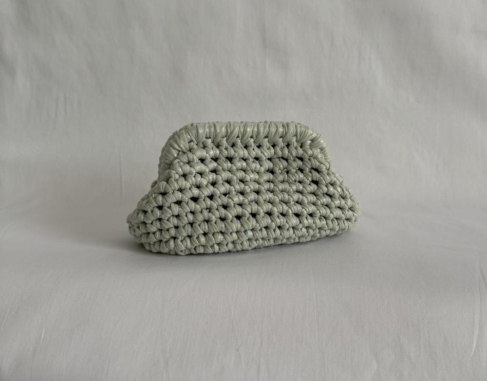 Light and refreshing, this mint-toned crochet clutch shimmers with soft yellow and silver hues. It measures 18 cm by 10 cm and is finished with a secure snap top closure. A detachable silver chain strap woven with matching yarn allows for crossbody, shoulder, or handheld styling. Fully lined for durability, it’s a playful take on modern elegance.