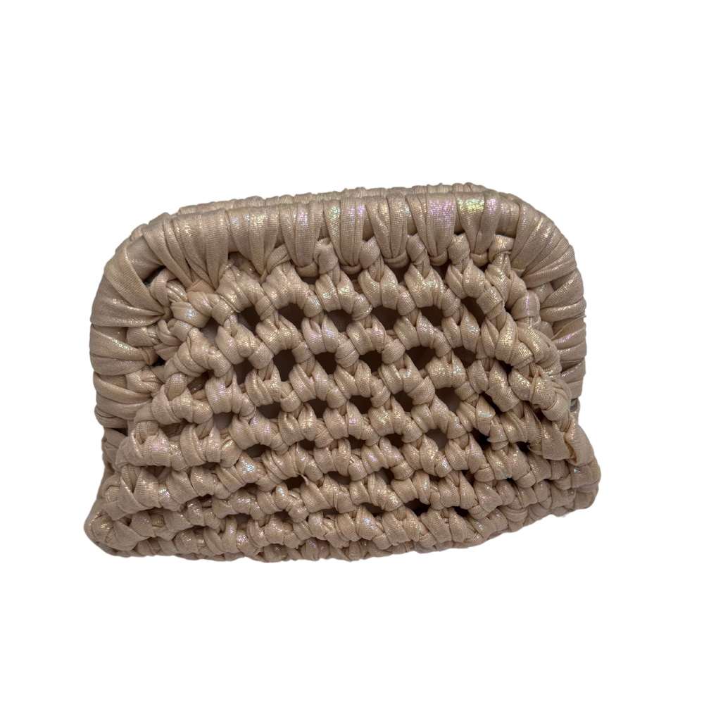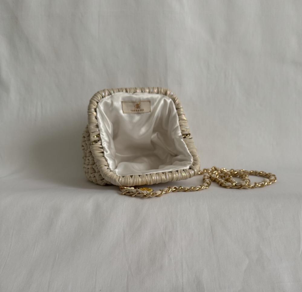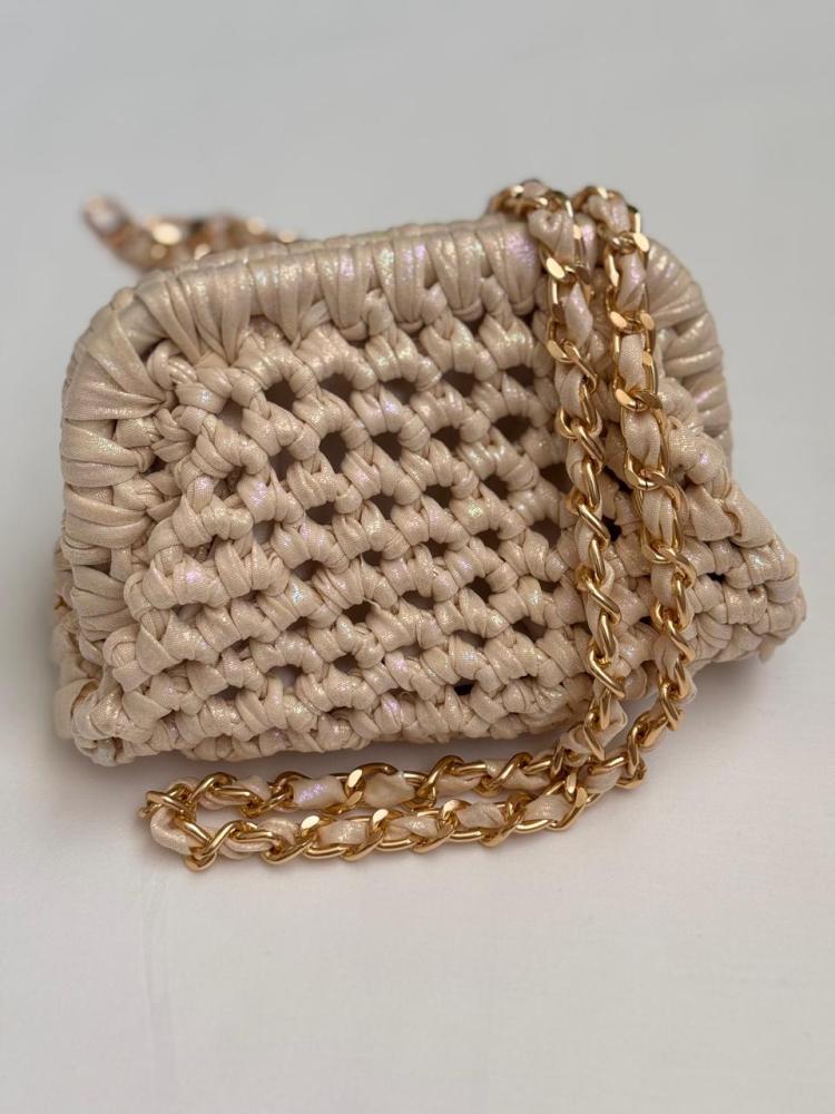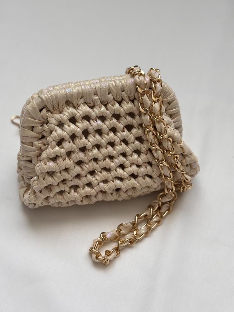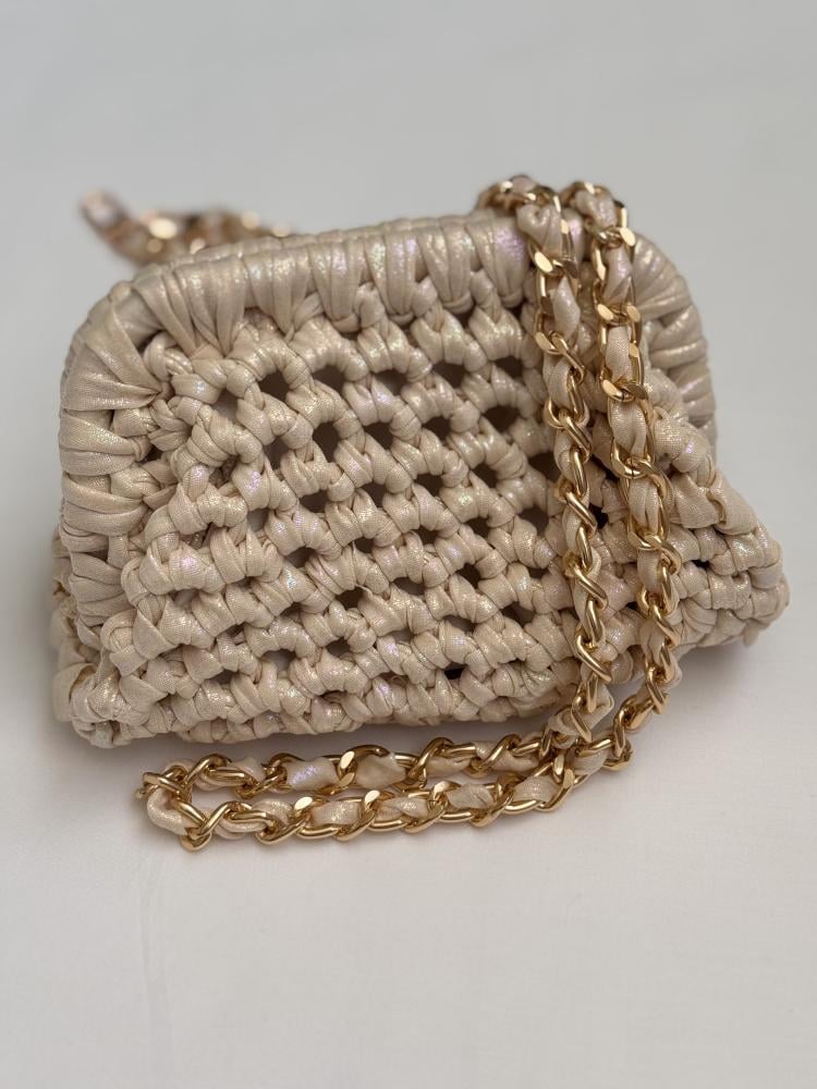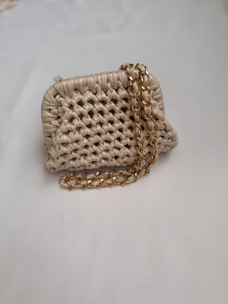An elegant pearly white crochet clutch measuring 18 cm in length and 10 cm in height, with a soft luminous finish. Designed with a snap top closure for convenience and security, it includes a detachable gold-tone chain strap woven with matching yarn, so you can wear it crossbody, on the shoulder, or carry it by hand. Fully lined on the inside, it combines effortless chic with practical design.
